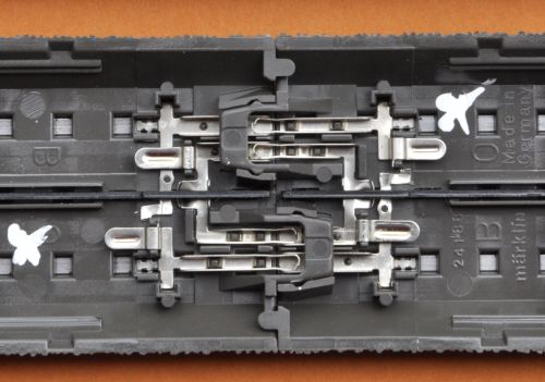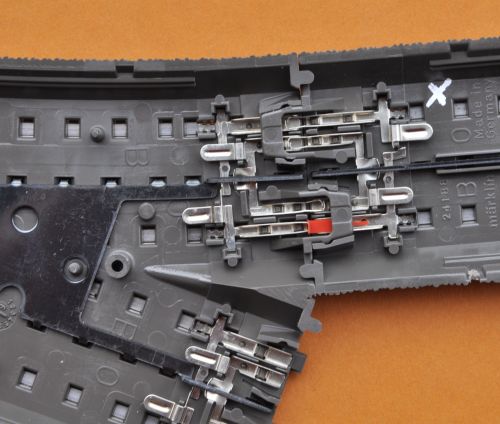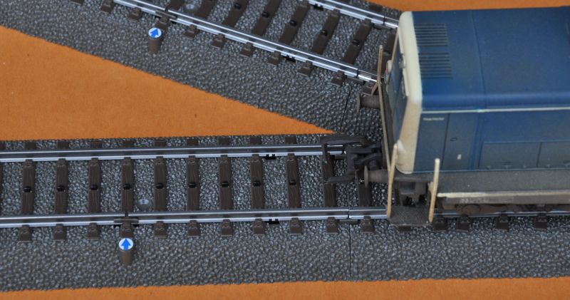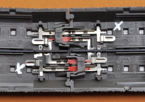 Im Verlauf der Kontaktstrecke ist jedes Gleis 2 mal aufzutrennen. Deswegen sind hier beide Gleisenden gekennzeichnet. Beide Brücken sind präzise flach gelegt worden, um einen Kurzschluss sicher zu vermeiden. | |