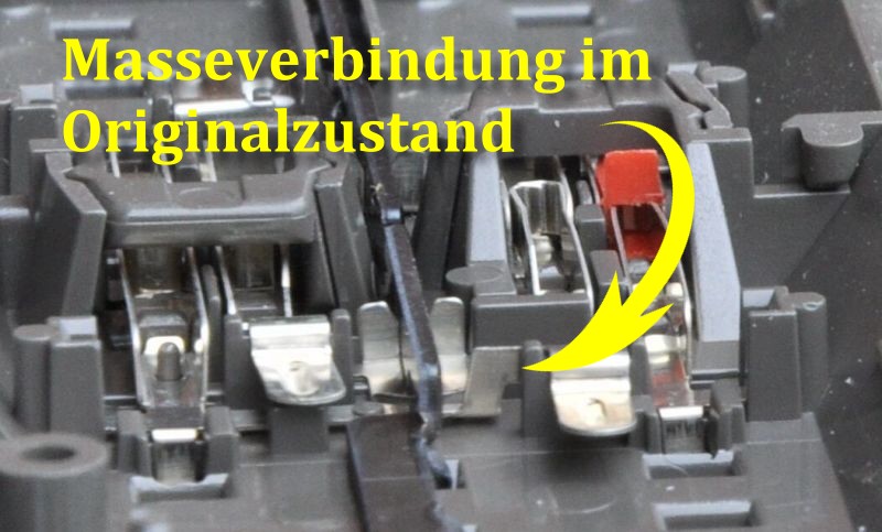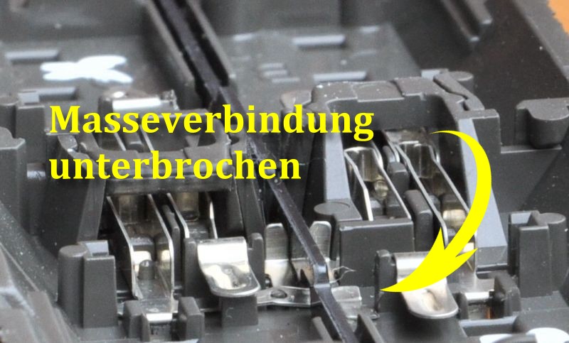 Achtung: Das Übergangsblech darf nach der Trennung keine Verbindung zum Mittelleiter bekommen. Am besten biegt man das freie Ende mit einer Schraubendreherklinge flach an den Gleiskörper.