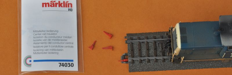 Kontaktstrecken lassen sich jedoch auch ohne diese Gleise einrichten. Deshalb darf an den Bü auch ein anderes Gleis angrenzen. Die Isolierungen 74030 sind dann anstelle der Kontaktlgeise erforderlich. Jede Packung enthält 8 Isolierungen. Im Gegensatz zu Mittelleitertrennungen, wo 2 Isolierungen benötigt werden, ist für Massetrennungen nur ein rotes Hütchen erforderlich. Die äußere Kontaktklemme überträgt Masse. Siehe unten. Die roten Isolierungen sind nur an den Begrenzungen (Anfang und am Ende) der Kontaktstrecke erforderlich!