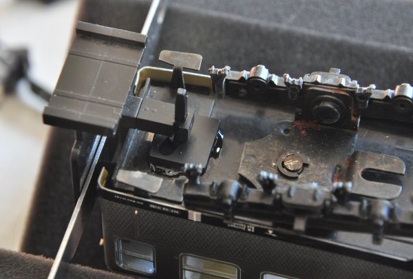 Um eine ebene Auflagefläche für die Kulissenführung zu erhalten, wird entweder das Blech der Vorentkupplung ausgebaut, abgetrennt und gerade gerichtet. Dieses Blechstück wird dann unter dem Wagenboden zwischen die Trittstufen eingeklebt. Alternativ kann man den Blechstreifen heraustrennen, der quer über den Wagenboden verläuft. |