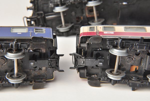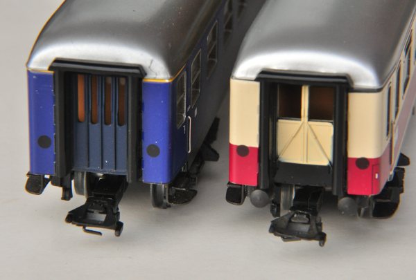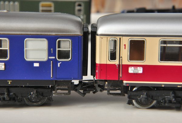 Hier ist das rechts das Modell des TEE-Wagens mit kleinem Raddurchmesser von 10,4mm zu sehen. Bevorzugt wird man hier den Schacht 103 einsetzen. Der Vorteil liegt eindeutig im leichteren Kupplungswechsel bei diesem Schacht. Sofern man auf Radius 360mm fährt und das Fehlen der Puffer zu verschmerzen ist, lässt man diese einfach weg. Gerade bei stromführenden Kupplungen ist ein Kontakt gegen Masse unbedingt zu vermeiden, was eventuell bei der Berührung von Kupplung und Puffer in Kurvenfahrten möglich wäre. Rechts mit Puffern, blauer Wagen links ohne Puffer. |