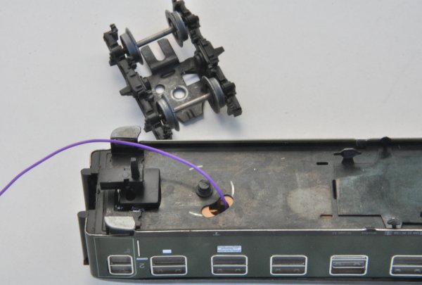 Hier die eingeklebte Kulissenführung an einem Modell mit kleinen Rädern von 10,4mm. Das Kabel führt später zur stromführenden Kupplung. Masse hat der Wagen ja wohl genug. Dafür braucht es kein Kabel. |