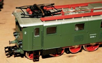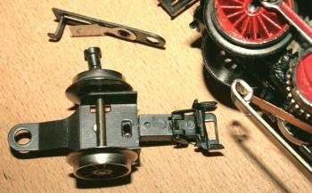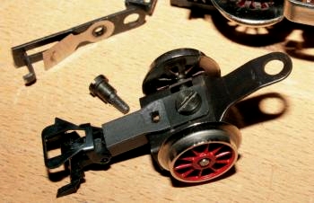 Die Vorlaufachse dieser Lok ist sehr nah an der Pufferbohle angeordnet. Deshalb erscheint mir eine Umrüstung auf Kulissenführung nicht möglich. Doch mit einem angeschraubten Schacht erzielt man bereits ein kürzeres Kuppelvergnügen.