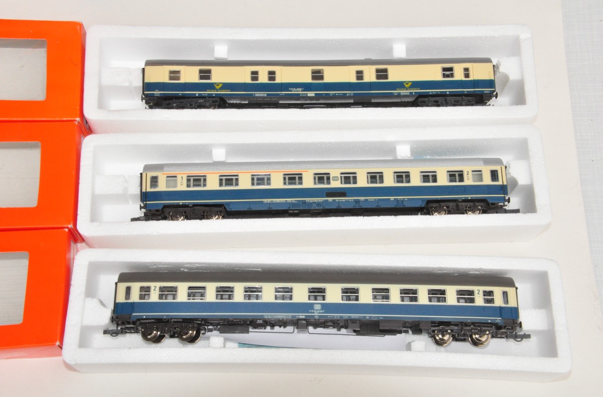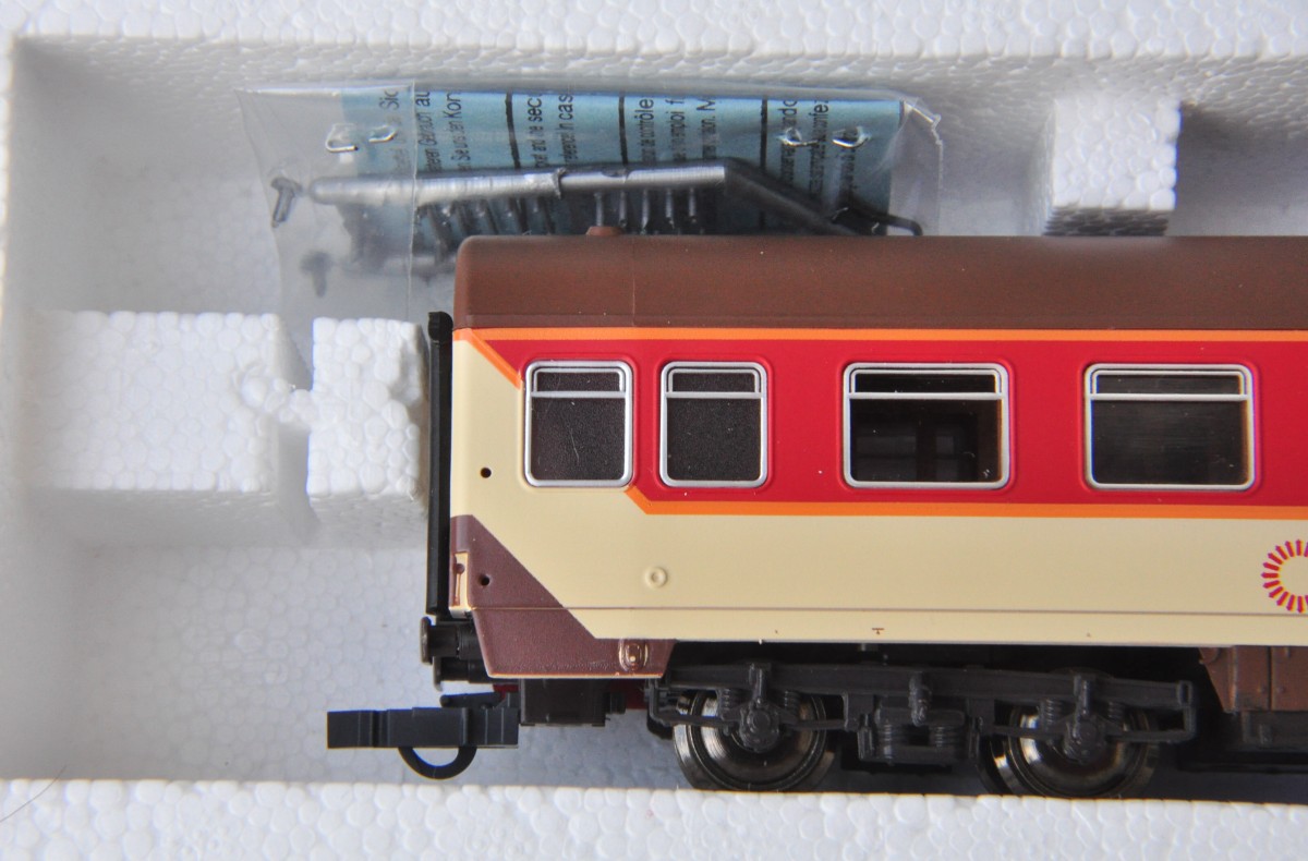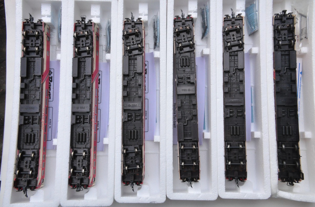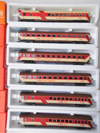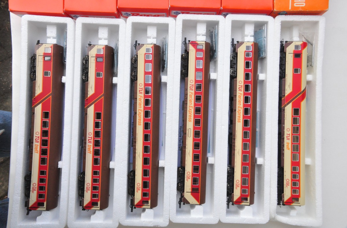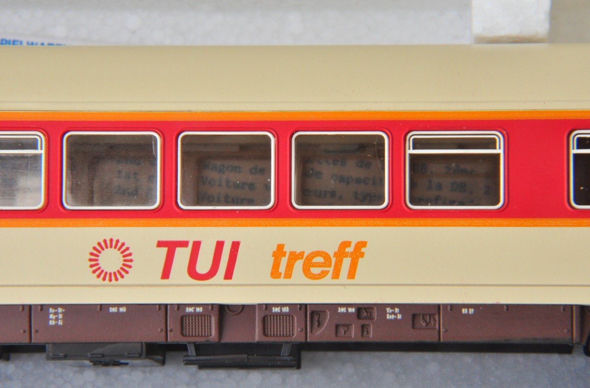 Roco TUI-Reisezugwagen 6 Personenwagen H0, Gleichstromradsätze, die Wagen sind sehr wenig gelaufen. Teilweise mit neuen DC-Radsätzen bestückt. Die Zurüstbeutel liegen bei. Es wurden bisher keine Teile montiert. 1 TUI-Treff Wagen altes Farbschema: Roco 4227A; 61 80 09-90 201-5, Radsätze DC gebraucht 3 Wagen TUI-Ferienexpress: Roco 44229; 61 80 05-70 118-9, Radsätze DC neu, beidseitig isoliert 2 TUI-Treff Wagen: Roco 44228; 61 80 09-70 203-5 , Radsätze DC neu, beidseitig isoliert Bild 1 - Bild 2 - Bild 3 zeigt Beschädigung - Bild 4 Die Wagen werden nur komplett verkauft. Setpreis 156,00 € |
