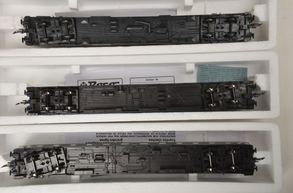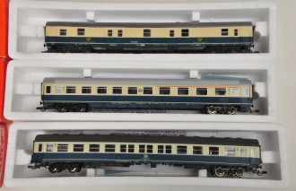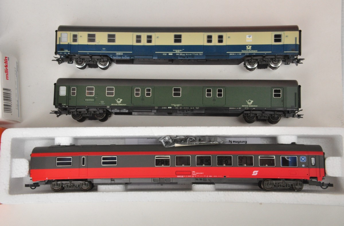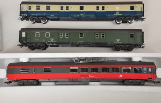 Märklin und Roco Personenwagen 3. Märklin Post-Gepäckwagen türkis 4280 mit 27cm Länge, KKK, 500 Jahre Post, keine Gebrauchsspuren, 508000-95159-2; Preis: siehe unten 4. Märklin Post-Gepäckwagen grün 4157, KKK, neu, keine Gebrauchsspuren, 508000-35067-9; Preis: siehe unten 5. Roco-ÖBB-Speisewagen 303mm, 44647, keine Puffer gesteckt, DC-Achsen fast neu, Zurüstbeutel ungeöffnet, Zuglaufschild als Schiebebild; 61 81 88-70 100-6; Ersatzpuffer haben die ET-Nummern 98800+98801, Preis des Wagens: 22,- € alle Wagen mit Roco-Universalkupplung - kann auf Wunsch auf Märklin getauscht werden. Die Wagen 1, 2, 3 und 4 werden nur zusammen verkauft. Setpreis: 84,00 € |