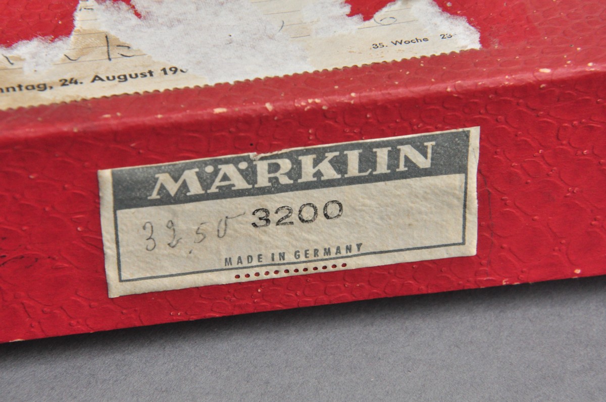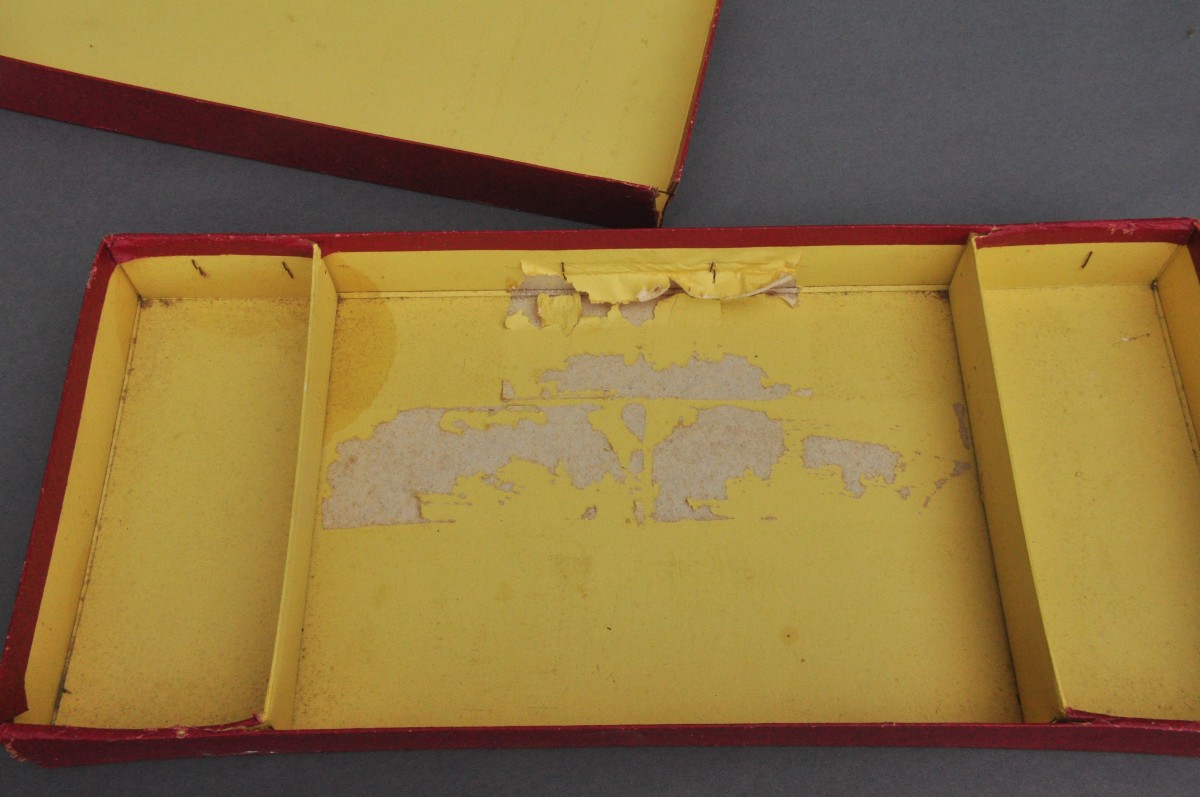 Märklin Leerkarton mit seitlichem Aufdruck: 3200 Das Produktionsjahr müsste 1963 oder früher sein. Ein aufgeklebter Zettel auf der Oberseite wurde halb entfernt. Wasserflecken auf dem Bild. Obwohl an einigen Kanten die Klammern bereits beschädigt sind und innen ebenfalls Blessuren sichtbar sind, hat diese Packung doch einen besonderen Reiz. Preis: 35,- € Bild 1 - Bild 2 - Bild 3 |